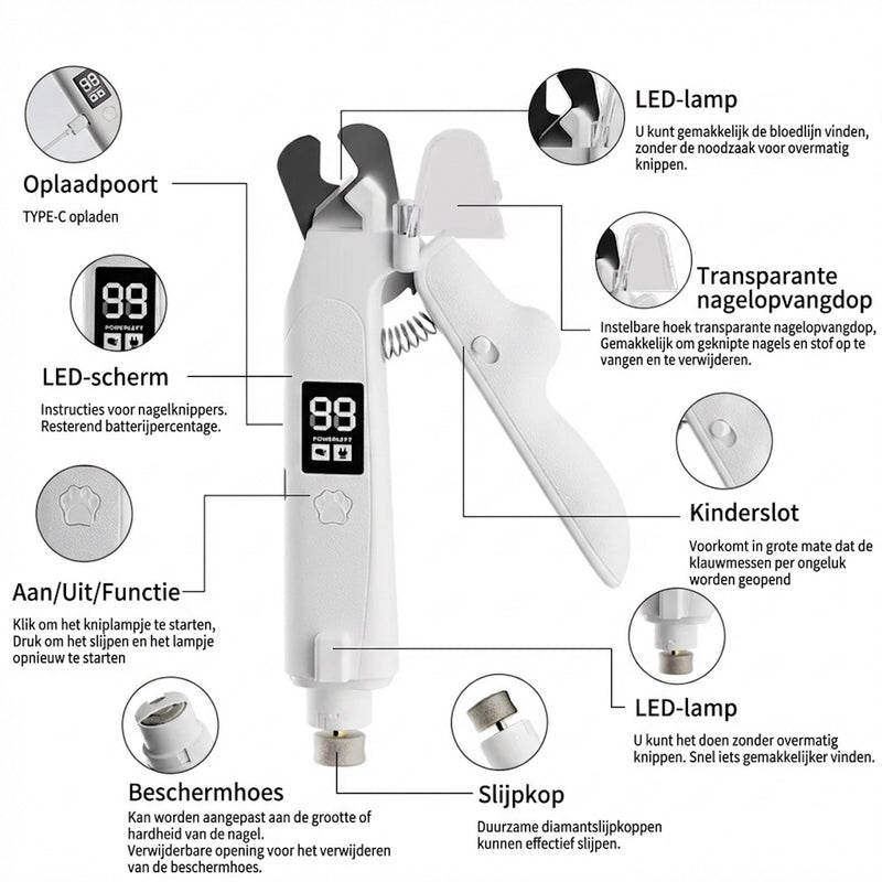 Het apparaat is voorzien van een fysiek slotmechanisme om onbedoeld gebruik te blokkeren. De slijpkop bevat een afneembare beschermkap met drie specifieke openingen, afgestemd op de nagelomtrek van kleine, middelgrote en grote dieren.